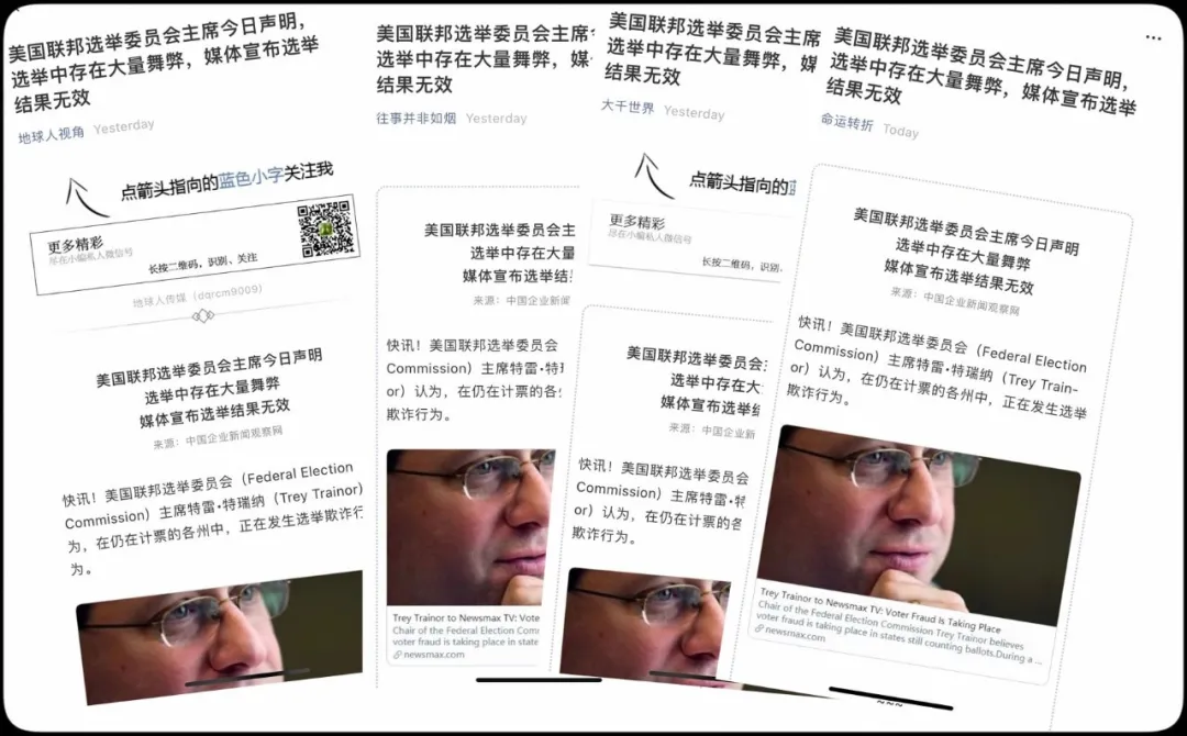不过该辟的谣还是要辟。 这篇文章要核查的是一个广为传播的消息: 美国联邦选举委员会主席宣布本次选举存在大量舞弊,媒体宣布的选举结果无效。