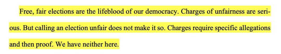 “自由、公平的选举是我们民主的命脉。(选举)不公平是很严重的一种指控。但仅仅声称选举不公平并不意味着选举就是不公平。指控书需要一有具体的说法,二要提供证据。我们听审的这个案子两者都没有。”法官Stephanos Bibas为由三名法官组成的判案小组这么写了结论。
