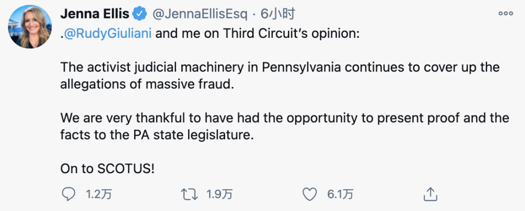 川普律师Jenna Ellis在周五的裁决后发推文:“宾夕法尼亚州的激进主义司法机制继续掩盖大规模欺诈指控,我们去最高法院!”