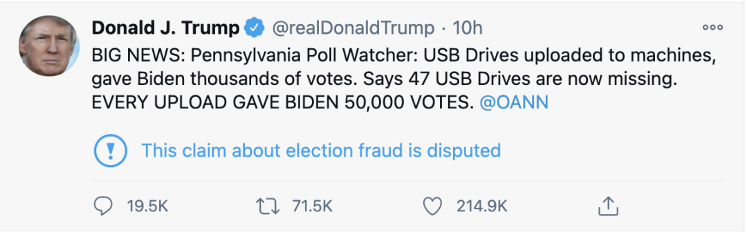 川普今天发布的“大新闻” 又被推特标注为争议信息