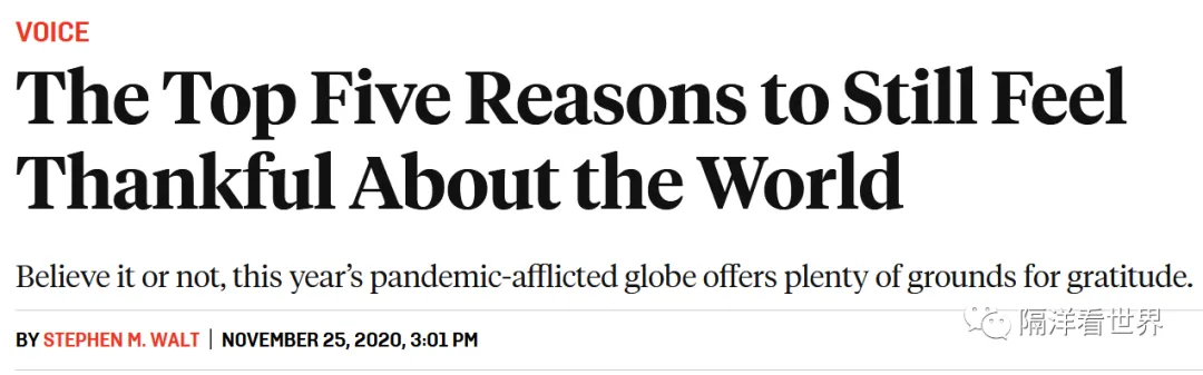 Original 英美研究刘博士 隔洋看世界 11月26日,美国人度过了一个非常不一样的感恩节。但是,有些东西还是一样的。例如,人们会回顾一下,在过去的一年里,哪些事情值得特别感恩。 01 哈佛大学知名教授感恩节感怀时连用9个形容词描述川普 美国时间11月25日,哈佛大学肯尼迪政府学院教授史蒂芬·M·沃尔特(Stephen M. Walt)在《外交政策》杂志网站上发表了题为《仍然对世界心怀感恩的五大理由》的文章。