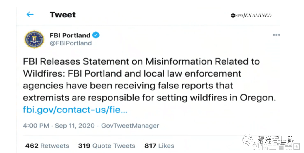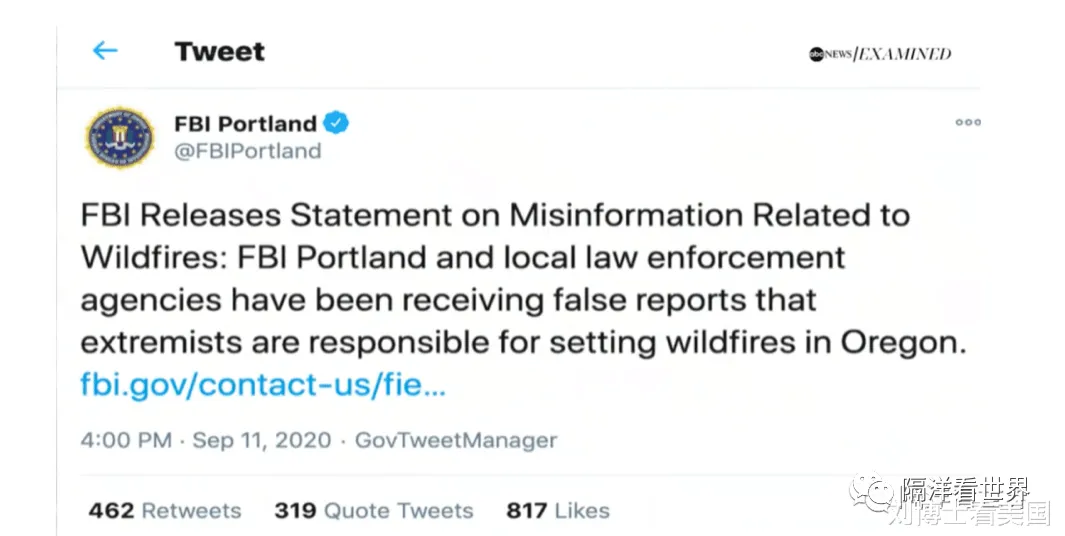 有人散布谣言说山火是极端分子纵火,FBI出面辟谣