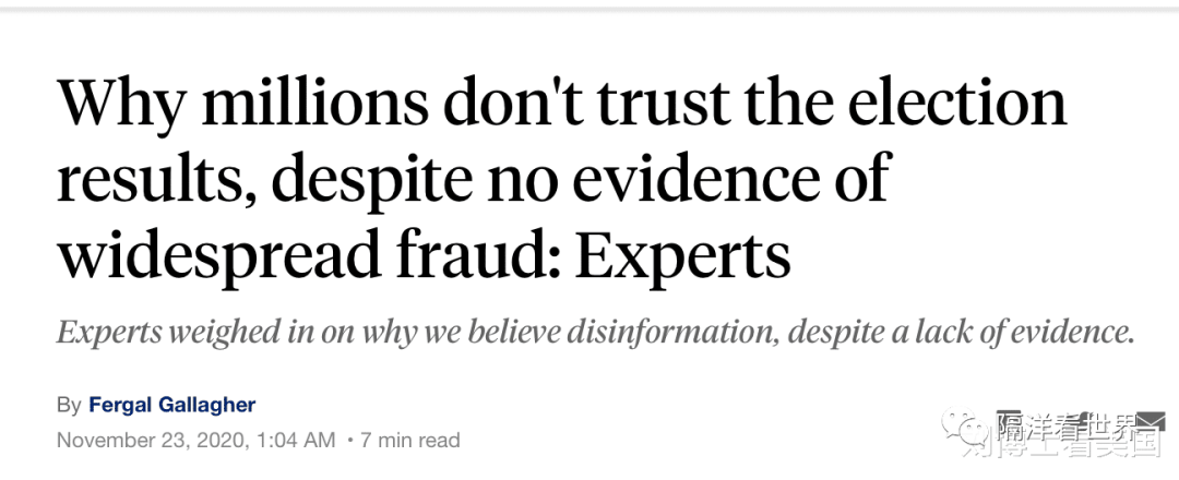 哈佛大学肯尼迪政府学院教授史蒂芬·M·沃尔特 他对川普对选举结果所做的种种挑战所带来的严重后果是这么说的:"挑战选举结果的种种企图,已经削弱了公民对一些美国的核心制度的信心、进一步损害了美国在海外的形象、而且让无缝(的权力)过渡变得不可能而把数百万美国人的福祉置于危险之地。" 然后,开始进入精彩内容了。他接着写道:"但是,说真的:对于一个厌恶女人的(misogynistic)、腐化的(venal)、好打官司的(litigious)、种族主义的(racist)、犯通奸罪的(adulterous)、逃税的(tax-evading)、逃避服兵役的(draft-dodging)、拒绝科学的(science-denying)和无可救药地不诚实的(irredeemably dishonest)骗子(con man),我们还能期待什么?在以往的美国,不乏腐败和危险的政客,但是期待这样一个有着严重缺陷的自恋者在被打败的时候有不同的表现,需要(我们)不仅仅对过去的四年加以忽视,还要对他的整个成年生活中的种种行为也视而不见。幸运的是,明显处于多数的美国人看穿了这个骗局,并且告诉他,'你被解雇了(You're fired)'。" 不能不说,这位哈佛教授是非常了解川普的!他用的这些形容词也是非常到位,绝对没有故意夸大之嫌!而且,还用上了川普在主持《学徒》节目中最经典的一句话来送给他,我也是醉了! 02 专家解读:为什么那么多川普支持者相信选举存在欺诈? 自11月3日美国大选投票日以来,许多虚假的欺诈指控被公布在社交媒体上,并在其他地方重复,其中多数很容易被揭穿,但大部分民众似乎仍然相信这些指控。