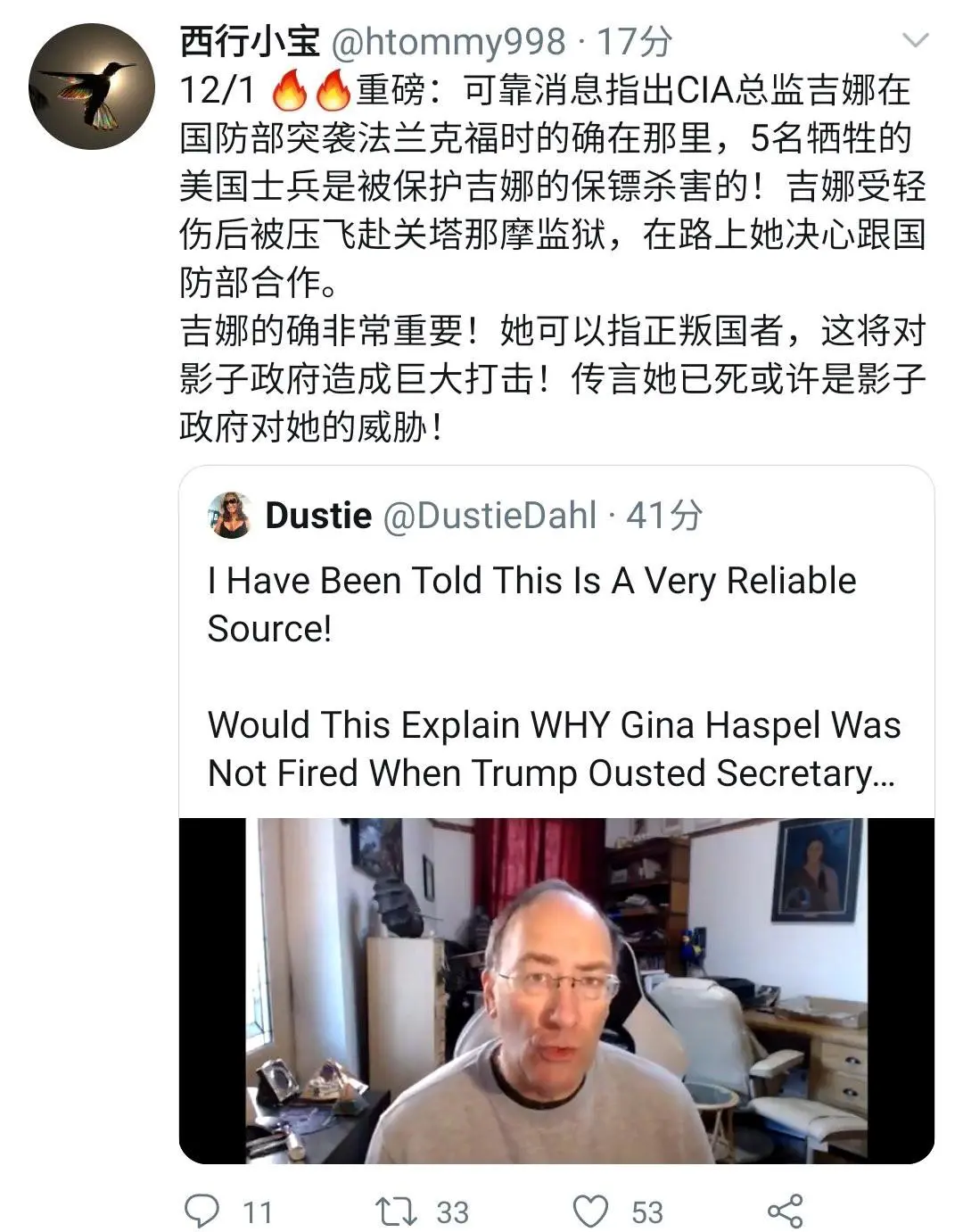又有一则谣言说,中央情报局(CIA)的主任Gina Haspel被抓,还发了一段一名女性被人架上一辆面包车的视频。