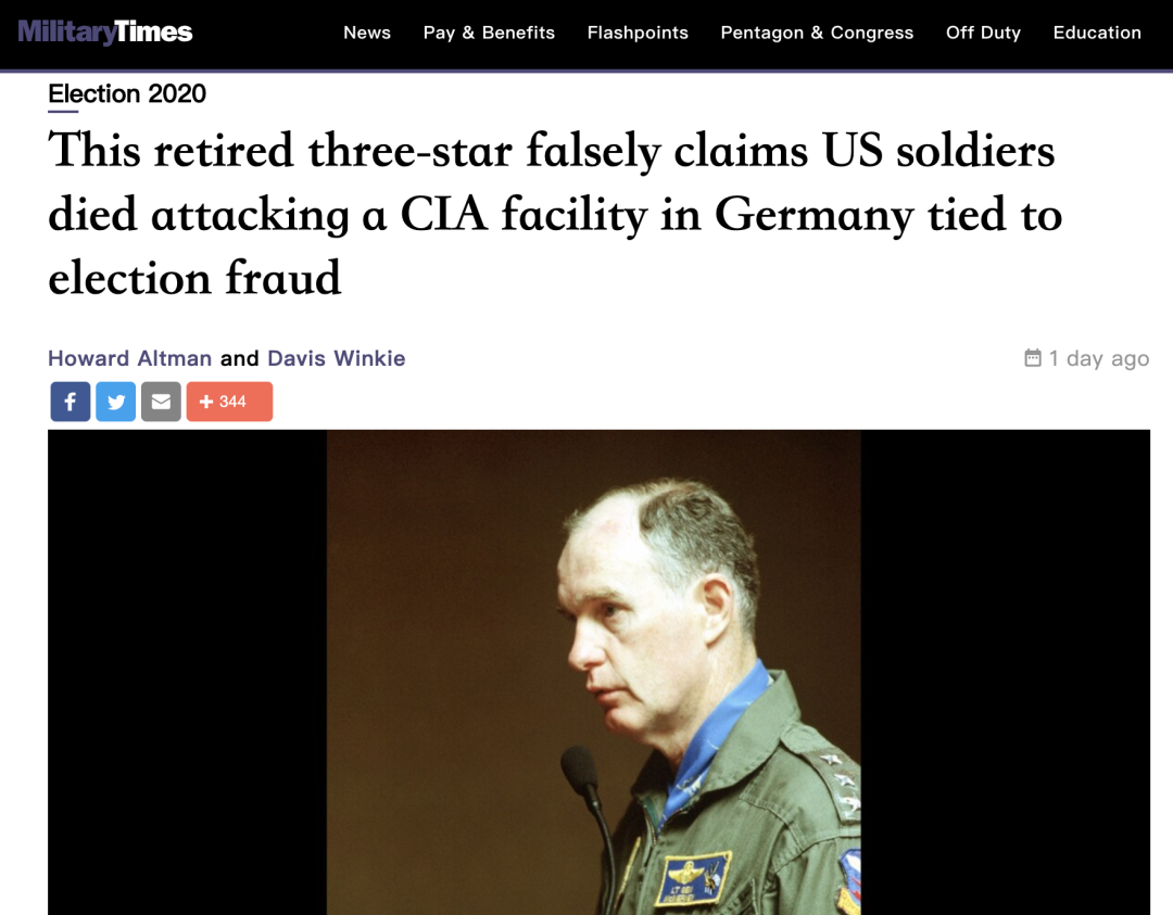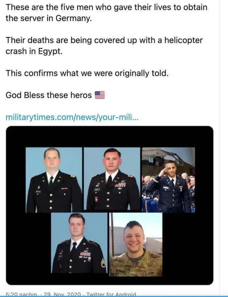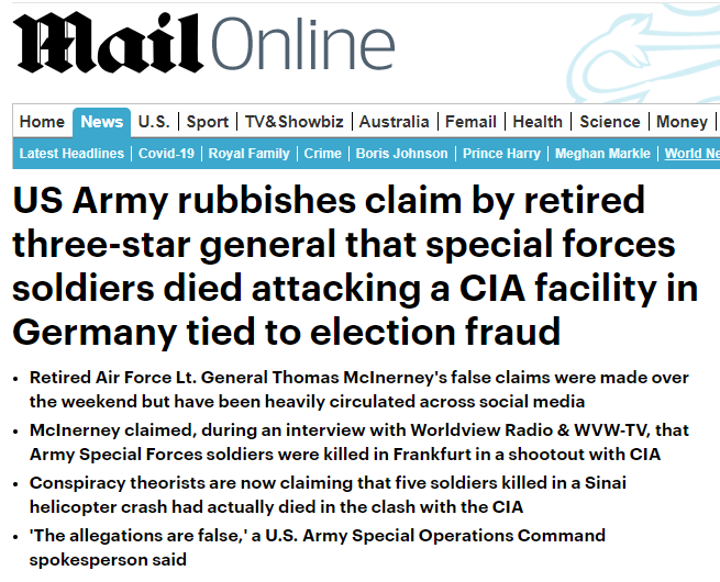 这一条就比较猛料了。日前网上流传了一篇署名“纽约及时羽”的公众号文章,叫《美国大选:浴血的服务器》(已被删)。说几天前网上流传的dominion服务器在德国法兰克福被美军截获的没人相信,现在有了新版本。新版本说这个服务器是归CIA所有,有陆军特种部队与CIA的军队(CIA还能有军队?)在法兰克福发生激烈的交火,一名CIA军官在交火中丧生,5名士兵也被打死。主流媒体为了掩盖事实真相,说CIA丧生的军官是在索马里被杀,5名士兵则是在埃及死于直升机坠毁。这种脑洞大开的好莱坞大片情节,还真有人相信。而且这条还跟前面说的CIA主任被抓的谣言联系在了一起。