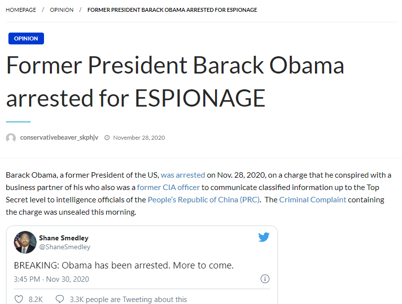 从11月30号开始,网上开始传前任总统奥巴马因为间谍罪被抓,并且其中一个依据是奥巴马的推特5天都没有更新了。