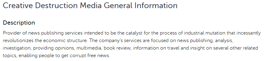 此外,在纽约吉时羽文章中出现的这张截图,出自于一个叫creative destruction media的网站。网上查到,这是一家2015年成立,说是致力于新闻发布服务的网站。该公司的服务专注于新闻发布,分析,调查,提供意见,多媒体,书评,旅行信息以及对其他几个相关主题的洞见,使人们能够获取没有腐败的新闻。所以并不是一个专业的新闻媒体,而是提供一个平台。说新闻媒体corrupted,倒是很符合右翼小媒体的腔调。