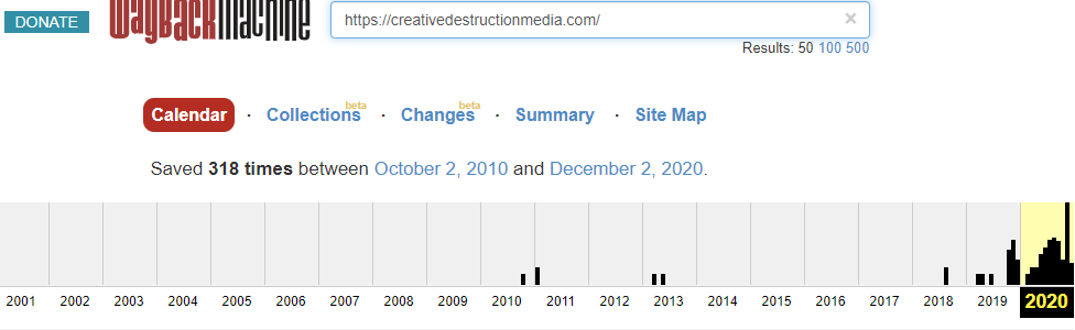 再用wayback machine查看,可以发现2019年之前该网站的内容都不多,到了2020年猛增。可见并不是一个值得信赖的平台。