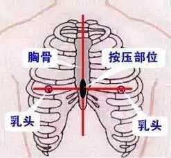 图 1:心脏按压点定位 心脏按压点的定位是在患者两乳头之间画一横线,在胸骨正中画一纵线,这两线交汇处就是心脏按压点。该定位法适用于男性和儿童,部分中老年女性的乳头位置变化很大,故不适合该法。 对乳头位置变化很大的患者,按压胸骨中下段的位置即可。 对心脏按压位置的要求来说,按压部位稍偏上或偏下尚可以允许,故心肺复苏指南对心脏按压部位的要求是「按压部位是胸骨中下段」,并没有非常准确的要求。但按压时千万不要左右偏离,一旦左或右偏离,按压部位偏出胸骨,就可能压在两侧的肋软骨上,造成按压损伤,甚至骨折。 心脏按压 按压手法:手臂长轴与胸骨垂直,右手手掌按压与左手之上,两掌根重叠,十指相扣,指端翘起。