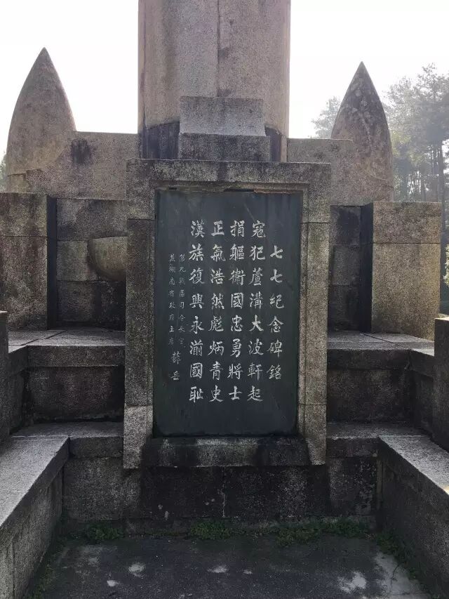 上午十点左右,志愿者一行来到了管理处,购票进入园区后,来到了南岳忠烈祠牌坊前,步入牌坊,映入眼帘的便是“七七事变”纪念碑,五颗石制巨型炮弹直指蓝天,碑座正前方和东西侧分别用汉白玉嵌有“七七”二字,寓全民奋起,勿忘国耻,“武力御侮”之意。