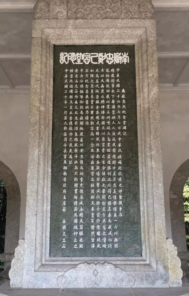 “七七”纪念碑后方为纪念堂,纪念堂的正中竖立着一块高达6米的汉白玉石碑,碑上刻有薛岳撰写的《南岳忠烈祠纪念堂碑记》。碑记介绍了建祠的历史背景、经过,讴歌了对英烈们捐躯卫国、视死如归的崇高精神。