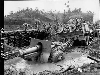 1945年2月15日,在缅甸腊戍以北55英里处,第2炮兵连的一门155毫米榴弹炮陷入溪流,找来一台卡车拖拽。(美军通信兵(U.S.Army Signal Corps)拍摄)