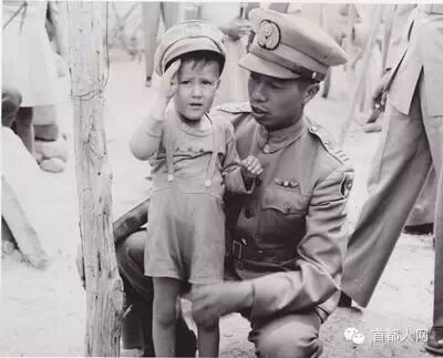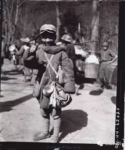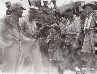 1944年9月2日,中国军队第14师42团队列里最年轻的士兵。他就是云南人李乐贝(音Lee Lew Bell)上等兵,年仅12岁,但是已经入伍一年。图为他正向两名美军联络官夸奖他的汤姆式冲锋枪。左:俄克拉何马州的步兵联络官莱缪窑约翰逊(Lemuel S.Johnson)上尉,右:华盛顿州的医务联络官上尉。