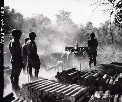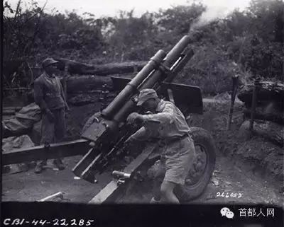 1944年12月11日,在巴莫,剩余的顽固日军正在遭受第三野战炮营第九小组的轰击。操作这些武器的正是受过美军训练的中国军队。