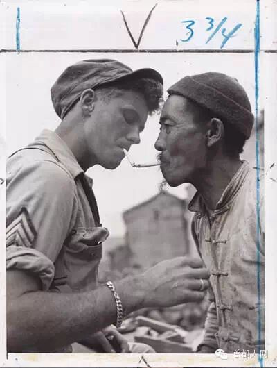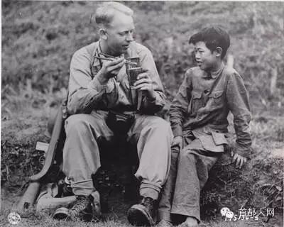 1944年5月6日,来自北达科他州的通信兵摄影师上等兵亚瑟.海吉(Pvt.Arthur W.Hedgo)在CBI(中缅印战区) 战场用中国筷子吃他的美国干粮,身旁的小孩李田右(音:Lee Ting Yow)在教他使用筷子。海吉是在前线拍摄中国军队战地影片的途中停下来休息时吃他的食品的。