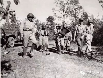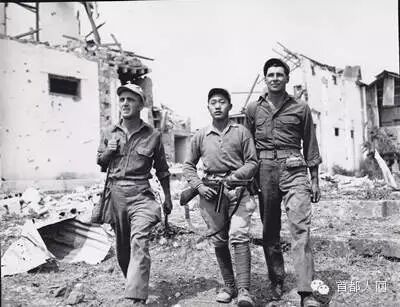 1945年3月15日,华盛顿的杰拉尔德·克瑞甘(Gerald M.Creegan)上尉以及弗吉尼亚州的霍华德·格里高里(Howard C.Gregory)上尉,与他们的中国朋友正一起从缅甸腊戍的废墟走出来。他们隶属于第5野战炮团。(谢瑞尔(Shearer)美军通信兵(U.S.Army Signal Corps)拍摄)