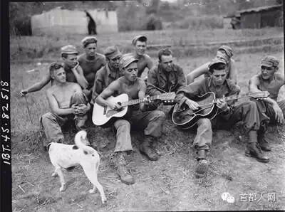 1945年4月12日,在缅甸腊戍附近,美军第49野战外科医生享受着美妙的音乐娱乐。(美军通信兵(U.S.Army Signal Corps)拍摄)