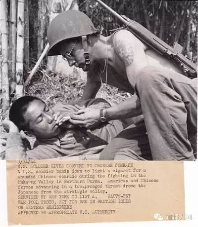 1944年3月31日,美军士兵慰问中国战友。在缅甸北部的胡康河谷,一名美军士兵弯下腰来给一名中国伤员点燃香烟。中美联军犹如两把锋利的叉子刺向日军,将敌人逐出了具有战略地位的胡康河谷。