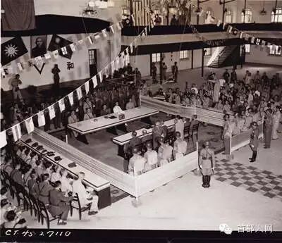 1945年9月9日,中国南京,从南京中央军事科学院的阳台上拍摄的日军签署投降书的长镜头。