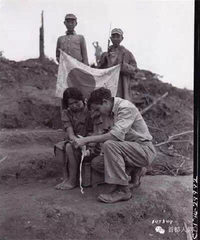 1944年9月7日,来自俄克拉荷马的第五技术兵梅尔·L·汀斯利正在给一日本女子进行紧急救护。这名日本女子在中国第八陆军收复松山阵地时受伤被擒。两名中国士兵在展示俘获的日军旗帜。