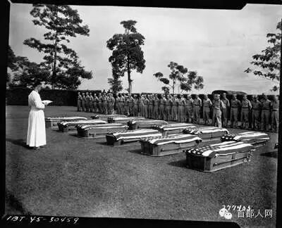 1945年8月19日,在印度潘诺图拉(Panatola)的美军墓地,密歇根州底特律的随军牧师威廉姆·鲍尔斯(William E.Powers)为13名在缅甸丛林中阵亡的美军空中运输部队战士举行葬礼。遗骸是由位于印度阿萨姆邦查巴(Chabua)的第105军需处墓地登记小 队(105 QM Graves Registration Platoon)的人员从坠机现场打捞并复原的。