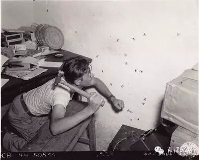 “哗!”,还有另一个目标在墙上。加州的詹姆士·罗布农(JamesH.Lobnow)技术军士手执钉锤,对一群侵入印度蓝姆枷的“B-29”狠狠打击,当“烟消云散”的战斗结束后,发现墙上停歇着众多“飞机残骸”。“哦!真不少!这就是残酷的战争!”恐怕只能这样感叹如此奇观了。(凯佛茨(Keyfetz)参谋军士(美军通信兵(U.S.Army Signal Corps)拍摄)