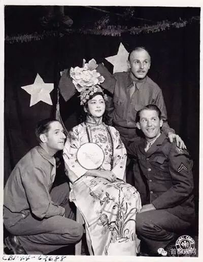 美国士兵与一个展示中国服饰的模特。从左到右依次为:大兵拉尔夫·柯蒂斯,来自波士顿的马萨诸塞;一等兵L·S·罗森,来自波士顿的马萨诸塞;下士约翰·E·史密斯,来自马萨诸塞。