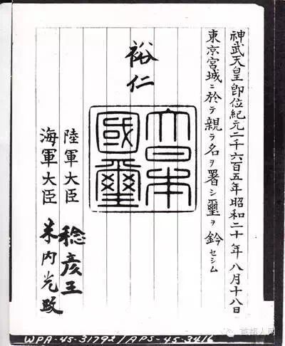 这是一张日本代表团给总参谋长麦克阿瑟将军的帝国凭证,在照片中心的是日本帝国图章构成的正方形。正上方是裕仁天皇的个人签名。