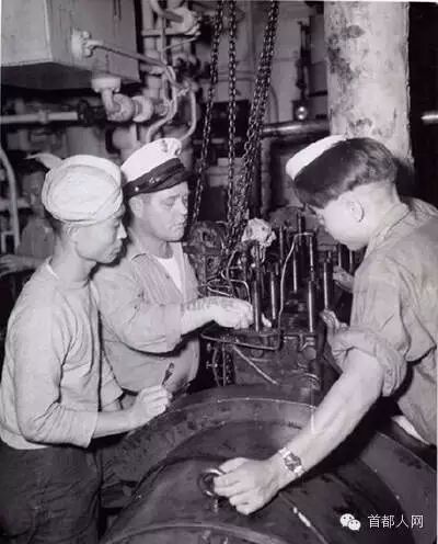 中国新式海军的八艘军舰,曾属于美国海军,正结束它们在加州圣迭戈的访问,掉头前往东方的基地。由受过美国海军培训的中国海军人员操纵船只。图为“永泰号”引擎在甲板上大修。参与人员为美国海军首席机械师大副罗伯特·加里森,外联海军军士。他正在演示引擎修理过程中的一个微妙要点。接受指导的是二等消防员李卫华(Lie kwe hwa)和袁长泰(yuan chang tai)。