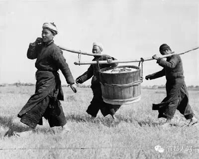 1944年4月6日,给修筑机场民工送饭。中国某地,三名中国民工巧妙运用两条杠杆抬一只饭桶,给机场上艰苦劳作的民工送去。全国上下大约有30万民工参与机场修筑工程,这些机场是由中美两国工兵规划设计的,以建立攻击日军的空军基地。