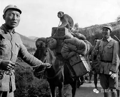 喜欢小动物是全世界士兵们的相似之处。在这里,卫立煌将军麾下的中国远征军正向中国西南的怒江前线集结。在那里,中国军队发起了滇西总反攻,以突破日军对滇缅公路的封锁。士兵们带上他们的宠物猴,放在为前线运输武器给养的骡马背上。弗兰克·多恩准将指挥的美军Y部队联络官小组,在前线与中国盟军一起战斗。(1944年7月10日,Y部队参谋部公共关系办公室照片。)