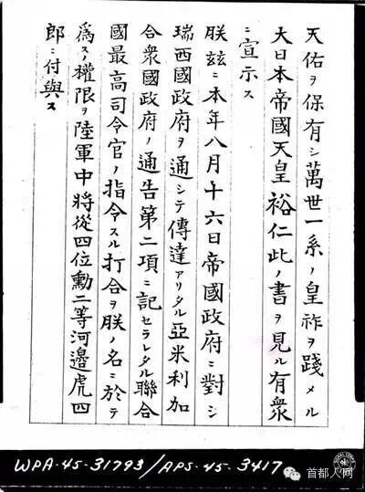 在安排投降要求的会议之前,这是日本代表团给总参谋长麦克阿瑟将军的帝国凭据的一页。【注:文中中国指中华民国】【转载自首都人网】