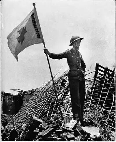 战时广州学生。这些爱国的男女青年组织起来,进一步加强民族抵抗力量。他们中的每个人都尽自己最大的能力来帮助抗战,年长的学生从军参战,医学科的学生和中学生共同成立了紧急救护队。这张照片讲述他们不知疲倦地救助那些深受战争伤痛的人的整个故事。这位紧急救护队的女学生在被炸毁的房屋废墟上,竖起了红十字会的标准 旗帜。(卡帕(Capa)/GLU/10拍摄)