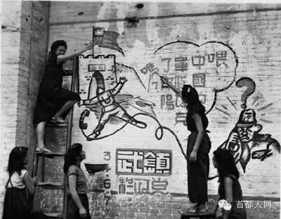 1945年9月28日,撤退的日军刚刚离开了华南,由艺术工作者组成的宣传队出现在街头,开始在布满弹孔的墙上告诉人们抗日救国的故事。这些宣传队由青年男女组成,他们紧跟挺进的部队,为士兵和百姓讲课,用图画告诉他们中国抗日战争所取得的胜利,他们还兼任新闻宣传员。(拍自华南日军撤走后的第一组照片)