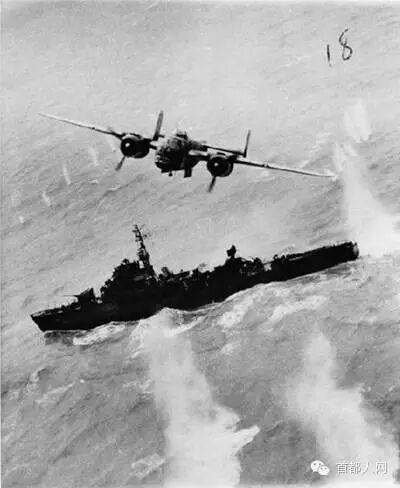 美国轰炸机的致命俯冲。它的弹仓门已开启,一架美国B-25轰炸机在南中国海上空咆哮着向它盯上的一艘日本护卫舰冲去;这艘护卫舰是当天被击沉的两艘同类型日舰的其中一艘。