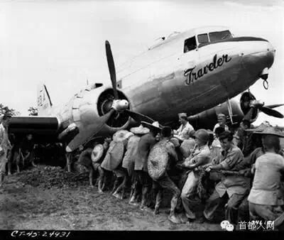 1945年6月13日,在中国南宁,一群中国民工和中美士兵携手将一架C-47型运输机拖出一个充满泥浆的炸弹坑,该机场刚刚从日军手中夺取。(美军通信兵(U.S.Army Signal Corps)拍摄)