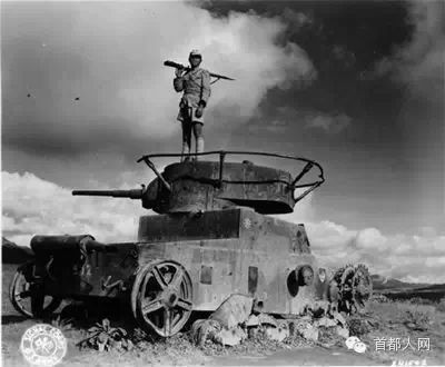 1944年10月11日,中国昆明,在中国的大坝机场,一名中国卫兵站立在一辆破旧的坦克残骸上警戒放哨。(摄影师:格林伯格(S.L.Greenberg)技术军士)