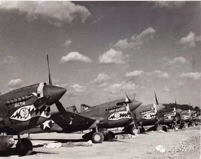 中国第十四空军总部,十四空军的战机——食人鲨,列队等待检修。这些战斗机在对日空战中取得惊人的十比一的好成绩。