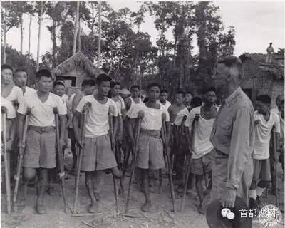 1944年7月15日,在沿列多公路某处的康复营地里,史迪威将军脱帽对着一群中国退伍军人讲话。战争遗留下的伤残军人先在此学习新的生存技能—铁匠、 编织、 木工等, 然后离开军旅回到平民生活。这个营地当时由中美共同管理经营,大约有两百多名退伍士兵(全都有不同程度的伤残)。(美军通信兵(U.S.Army Signal Corps)拍摄,美国战争信息办公室(USOWI)发布)
