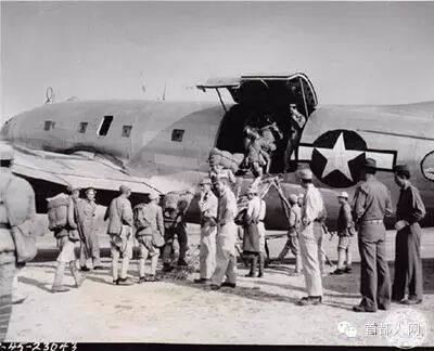 1945年3月9日,中国。第二百军的士兵踩着竹子桥登上C-46,这些士兵将被空运到东部前线。