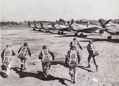 美国空军在华对日作战:在中国某处,当空袭警报拉响时,配备降落伞的美国飞行员们飞快地跑向他们的战机,升空驱赶来犯的日军飞机。这些驾驶美国飞机的队员在飞机引擎下方画了张鲨魚嘴。陈纳德将军的空中力量也包括轰炸机队,一直执行定期轰炸日军据点的任务。
