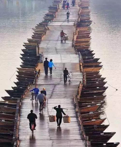 不对不对,这种木船桥是一种很古老形式的桥,是在南方不方便修建木桥或石桥的河上架设的桥。以前没有电动排水系统。这么多条船,如果冒着倾缸大雨去掏水,不说这活多艰辛,得多少人一起不停地掏水直到雨停呀!以中国人民的智慧,一定还有别的更省事的方法去掏水。没看出这船是封闭船,就是普通船。雅云再问问老家人有什么小秘密。