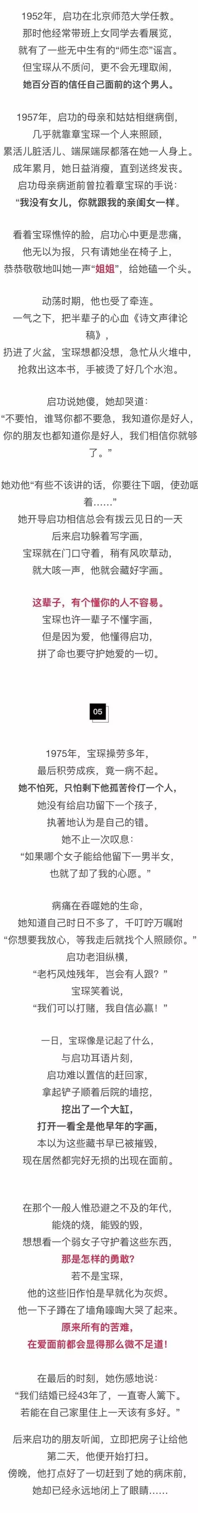 论年龄,她长启功2岁; 论相貌,她不算美人,个子不高; 论爱情,启功是听命寡母,非自由恋爱; 论家世,她生母早卒,继母刻薄, 不算大富大贵之家; 论学问,一俗一雅,一劳动妇女,一知识精英 她没有为他生下一男半女, 断了启功三代单传的皇族血脉…… 可是,两人结婚43年,相濡以沫, 同甘共苦,生死相依。