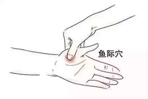 取穴:鱼际穴属手太阴肺经的荥穴,位于第一掌骨中点桡侧、赤白肉际处。