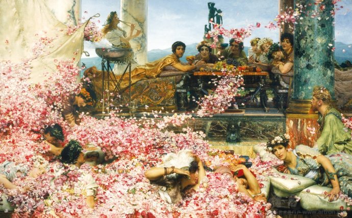 塔德玛描述了埃拉加巴卢斯的一个表面娱乐大众而实质十分诡异的主意:往出席皇帝晚餐的客人身上洒玫瑰花瓣。但是花瓣洒得如此之多,甚至把一些食客埋在底下喘不过气来。画家把皇帝安置在宝座上,观察着受苦的食客,旁边坐着皇帝的母亲和宠臣。在这幅画里,画家把人体和玫瑰花瓣溶为一体,把他的绘画技巧发挥到了极致。