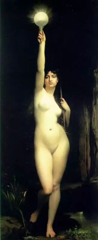94、朱尔斯·勒菲弗尔——真理(法国 1870年 265cm*112cm 布 油彩 巴黎奥赛博物馆藏) 这是具有象征意义的构思。画家以浪漫主义绘画的手法,描绘了身材修长的窈窕少女,少女纯净的眼睛凝视前方,体态匀称,曲线流畅,富于青春活力。无疑,美丽的裸体少女是真理的象征。她一手高举着“光明”,一手紧握一根绳索,形象地说明了真理既复杂又单纯。
