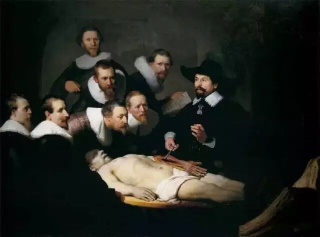 95、杜普教授的解剖课 伦勃郎 荷兰 1632年 油画 169.5×216.5厘米 藏海牙博物馆 这幅画为画家26岁时的成名之作。画家应阿姆斯特丹外科医生行会委托,为他们的行会成员画团体肖像。