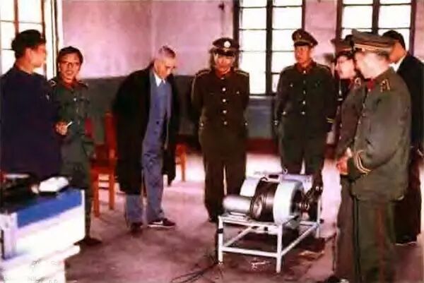 黄维兵败被俘后就寄情于科学研究。图为1980年,黃維和他以前的管理员们一起在抚顺工厂里钻研制造东方红永动机。