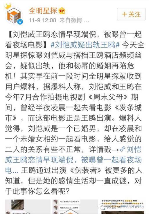 几乎每日一问:今天离婚了吗? 百传不衰的火爆程度真是厉害。 中午12时,八妹正在朋友圈愉快的刷着美国大选, 突然看到一条刘恺威出轨王鸥两人深夜看电影的爆料, 有图有真相,看的还是王鸥主演的《发条城市》。