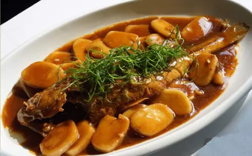 2、锅里留底油,先下五花肉片炒至吐油,其间加入姜粒、蒜粒和干葱头一起炒香,掺适量的鲜汤并放入年糕片和黄鱼,烧沸后调入盐、生抽、老抽、香醋、白糖、鸡精和味精。待小火烧至锅里只剩少许汁水时,把黄鱼和年糕铲出来装盘。